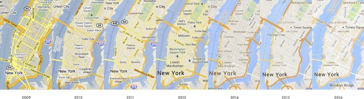 Similar to how a software engineer refactors their code before expanding it, Google has repeatedly refactored the styling of its map as it has added new datasets. And we see this in the evolution of Google Maps’s cartography: